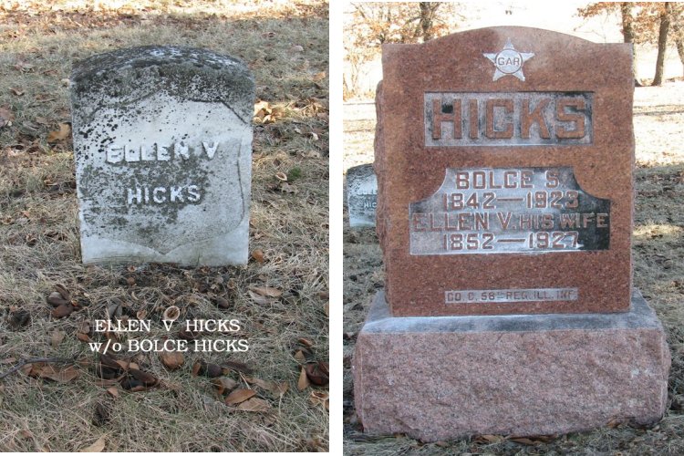 | Hicks, Ellen V. | 1852 | 1927 | wife of Bolce, Civil War veteran |