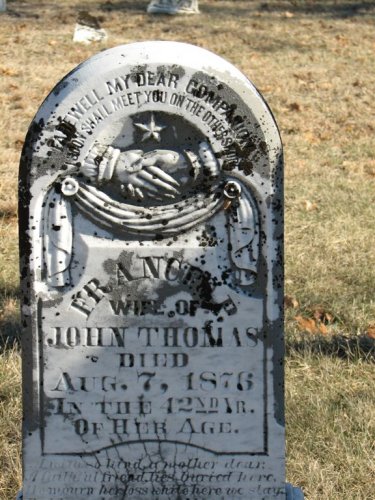 | Thomas, Frances P. |   | 7 Aug 1876 | 42nd year of age, wife of John, "A wife so loved, a mother dear. A faithful friend, lies buried here. We mourn her loss while here we stay But hope to meet in bliss someday." "Farewell by dear companion I soon shall meet you on the other shore." |